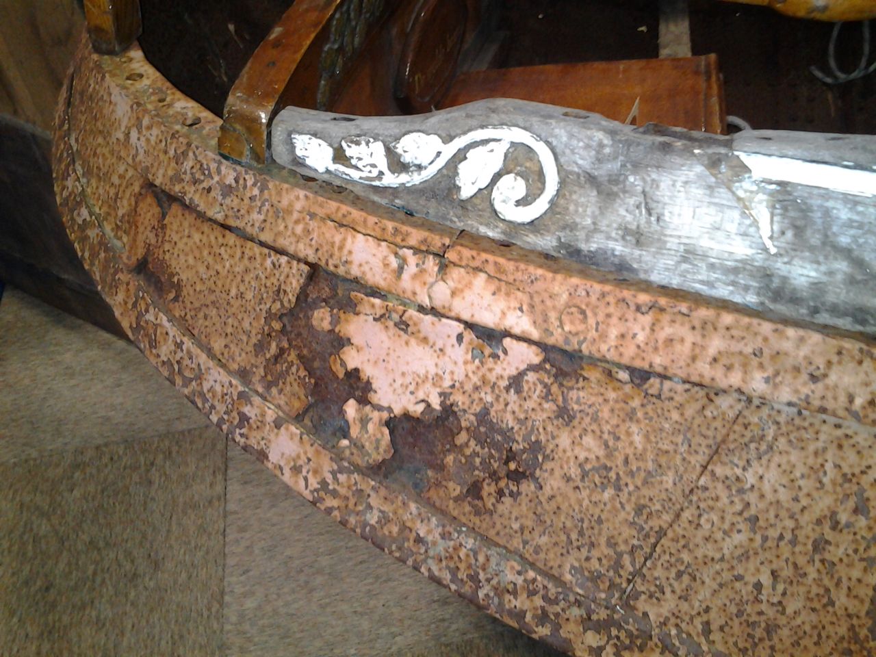 De messing slijtstrips die ik ooit op de kielbalk had gemonteerd bleken voor een deel verdwenen en ook de -toch wel serieuze- bouten van de motorspiegel bleken door roest half zo dun te zijn geworden. Dat laatste was mij bekend aangezien ik de motorspiegel al eens had gedemonteerd en provisorisch had hersteld. Het vervangen van die bouten dacht ik dus zelf wel even te klaren. Het losdraaien van de verroeste bouten en moeren viel tegen. Onder druk van de tijd en mijn ongeduld pakte ik de flex en alles was goed verlopen als ik die maar beter had gehanteerd. Nu sloeg ik het restant van de kop van de bout door het hout en dat beschadigde de zaak dusdanig dat ik woedend de hele motorspiegel met een mokertje er af mepte. Het gevolg was dat ik Michel en zijn maat Dex verzocht om het e.e.a. professioneel te herstellen, hetgeen geschiedde.